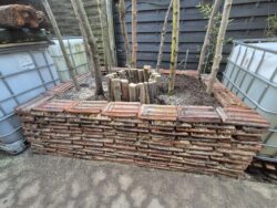 Eine kleine Erklärung zu diesem Projekt. Die Idee ist kurz gefasst, das ich das Carport Dach mit Kürbis, Melone, Yam und Erdbirne begrüne. Der Bereich hinter dem Carport ist es zu dunkel für eine Bepflanzung und das Carport ist damals für eine Dachbegrünung zu instabil gebaut worden. Durch die Erhöhung des Hochbeetes aus Dachziegeln kommen die Pflanzen schneller ans Licht.Wichtig ist, das die Hölzer nicht direkt auf dem Dach aufliegen und einen minimalen Abstand haben. Sonst würde das Regenwasser an dem Holz endlang laufen und es schnell verrotten lassen und das Regenwasser würde an der Stelle nicht in die Regenrinne laufen.In der Mitte des Hochbeetes ist eine Runde Aussparung mit Ästen um in dieser Vertiefung Unerwünschte Kräuter und Küchenabfälle einfüllen zu können, was mit EM und gegebenenfalls Pflanzenkohle ergänzt wird.